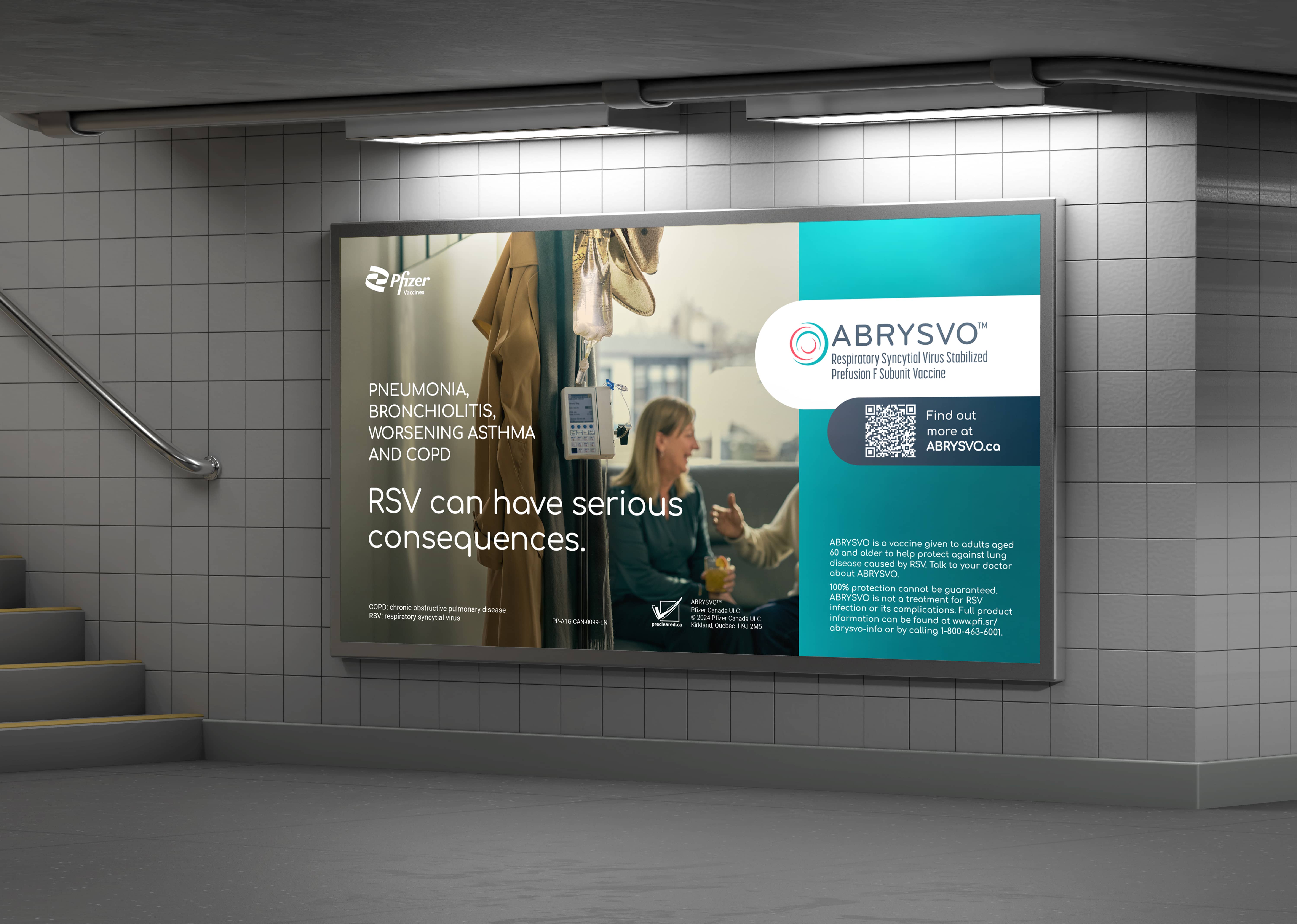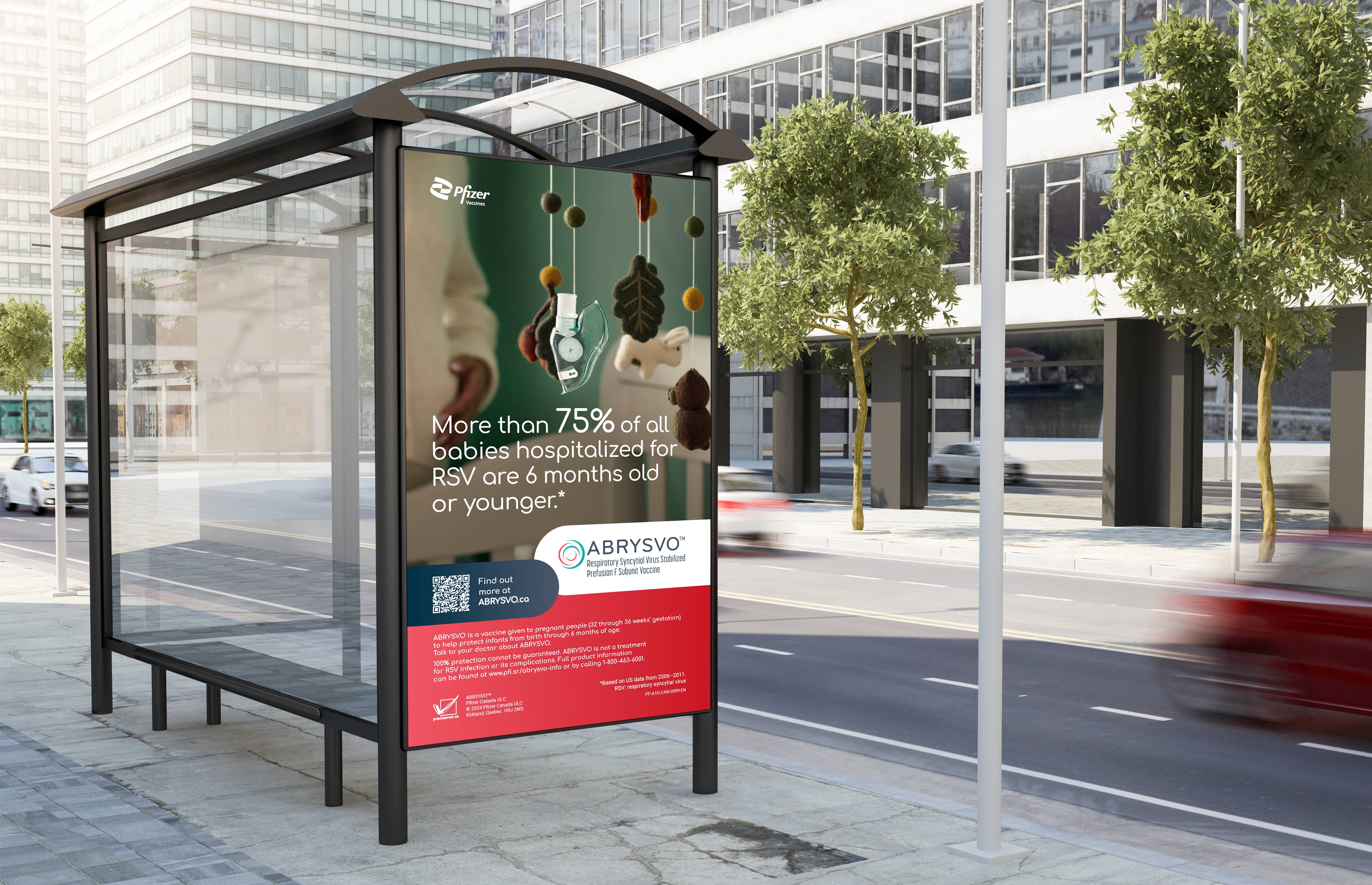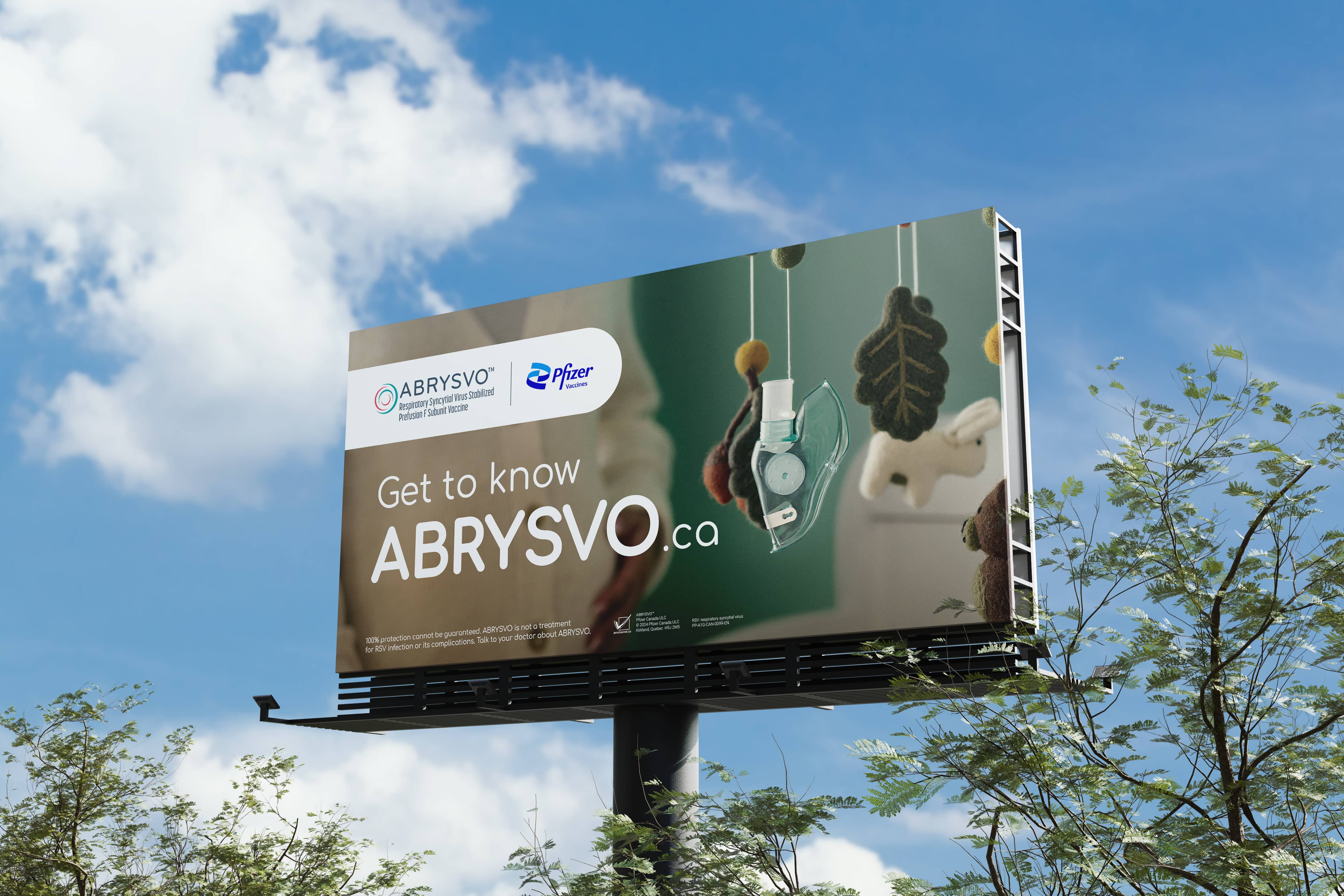 The striking images emphasize the importance of vaccination by highlighting the potential health impacts of RSV, which are quickly mitigated by the proposed solution: ABRYSVO, an RSV vaccine from Pfizer, which can help protect the most vulnerable groups (infants, through maternal vaccination, and adults age 60+) from the virus.